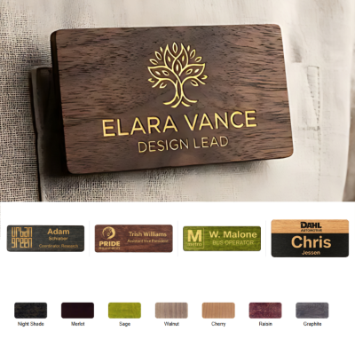 Made in the USA! Lightning fast turnaround. Our laser engraved wood name badge. Available in 7 different colors and finishes. Standard sizes listed. Individually personalized with no limits on lines of text. Custom sizes, and full bleed engraving available at no extra charge. Standard attachments include pin, swivel clip, strap clip, military clutch, and adhesive. Magnetic and Premium Pin fasteners available.